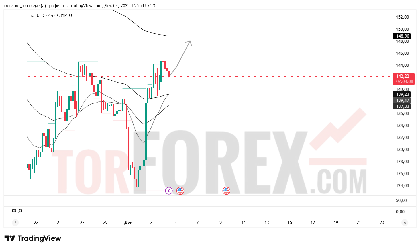 На 5 декабря 2025 года SOL/USD демонстрирует признаки коррекционного отката внутри восходящего тренда. Основной сценарий — движение к 145.00–148.00 USD при пробое EMA 50. Альтернативный сценарий — снижение к 135.00–132.00 USD при отказе от сопротивления.