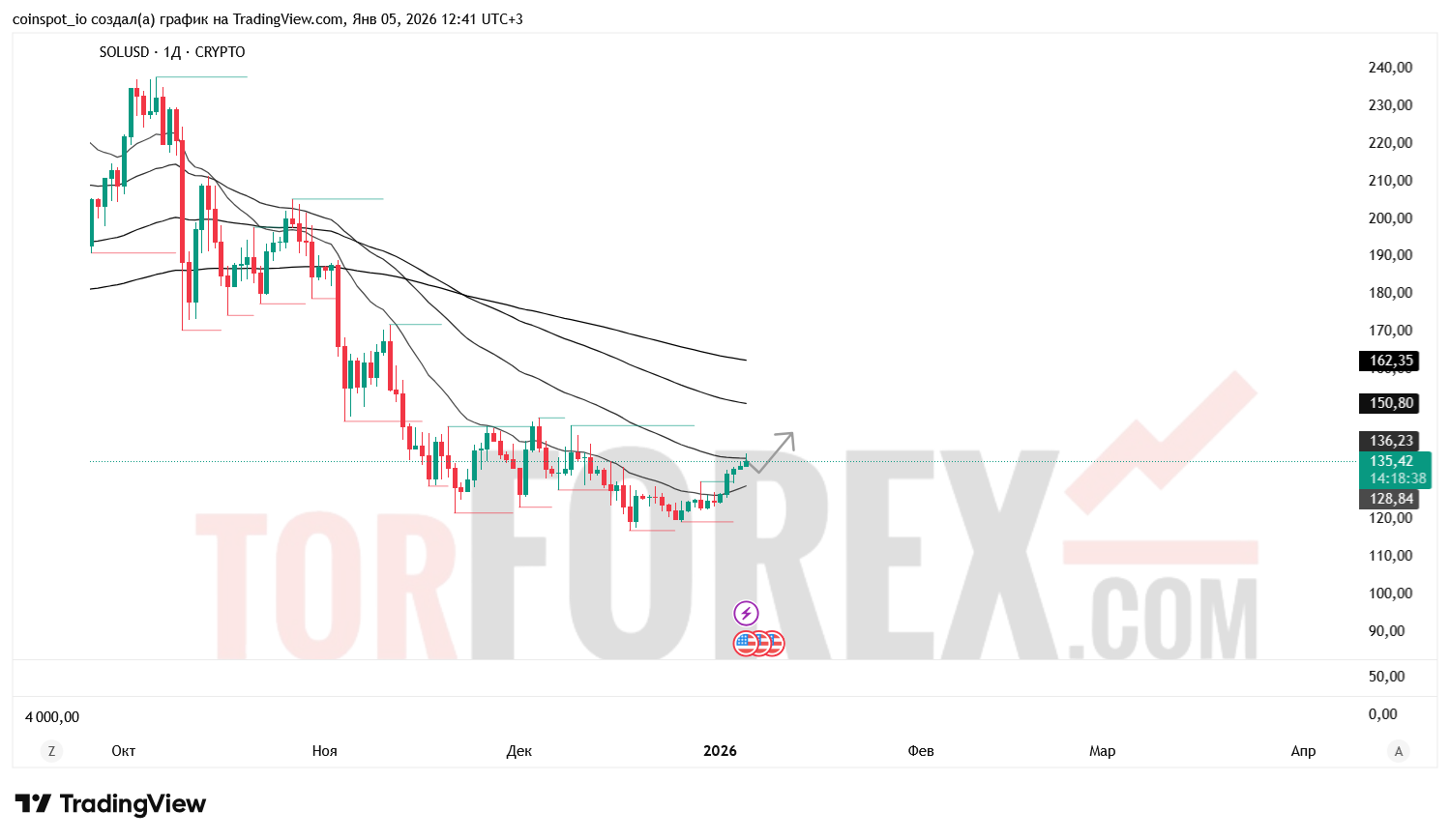 На момент анализа, цена Solana (SOL) торгуется на уровне 135,13 USD, демонстрируя умеренный рост на +0,79% за день. График на дневном таймфрейме показывает устойчивую восходящую динамику с признаками консолидации вблизи локальных максимумов. Актив находится в фазе тестирования ключевых уровней сопротивления, что делает предстоящий день критически важным для определения краткосрочного направления.