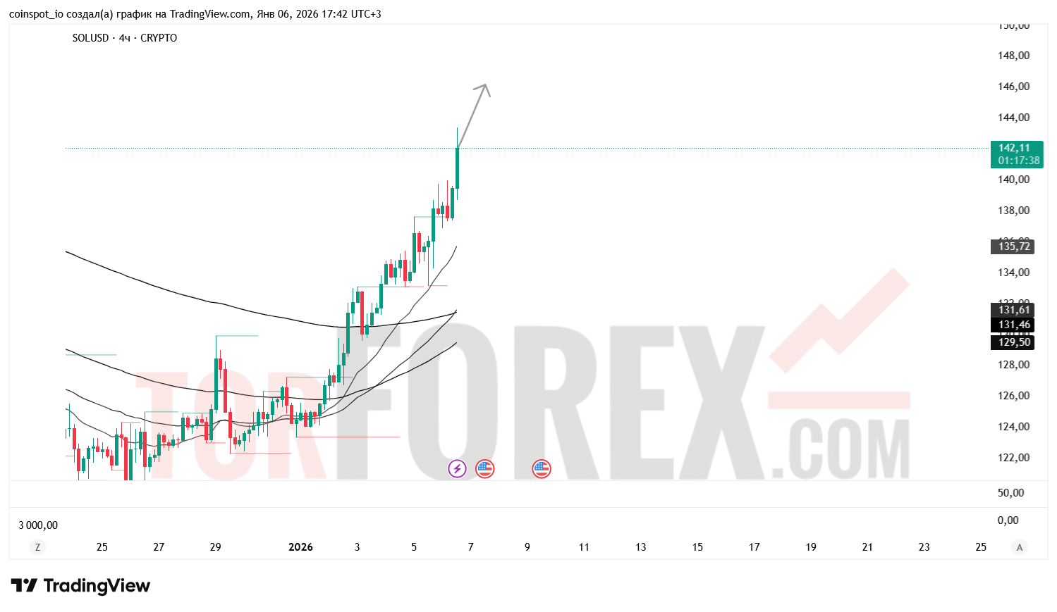 На 7 января 2026 года SOL/USD сохраняет уверенно бычью структуру с признаками продолжения импульса. Основной сценарий — рост к 146.50–150.00 USD при пробое зоны сопротивления. Альтернативный сценарий — откат к 135.74–131.46 USD при отказе от уровня 142.39 USD.
