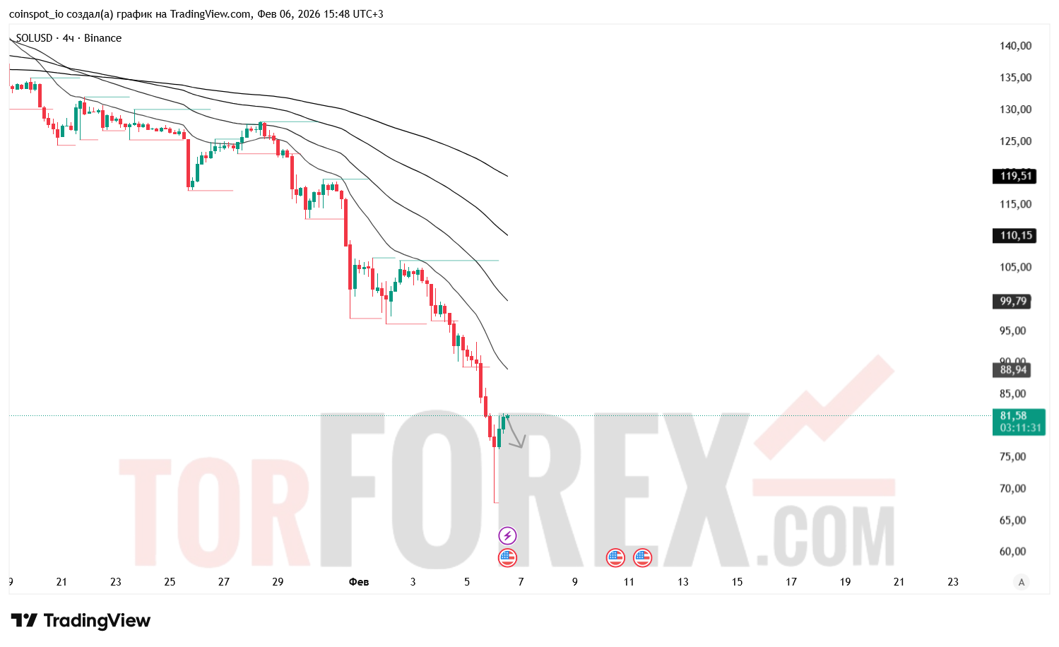 SOL/USD подходит к 7 февраля 2026 года в фазе агрессивного восстановления после глубокого снижения. Цена поднимается в область 81–82 USD, формируя уверенный бычий импульс на фоне роста крипторынка. Несмотря на локальное укрепление, общая структура остаётся медвежьей: нисходящий тренд не сломан, EMA‑лента направлена вниз, а pivot‑структура сохраняет последовательность LH → LL. Текущий рост выглядит как коррекция внутри более широкого нисходящего движения, но импульс покупателей усилился.