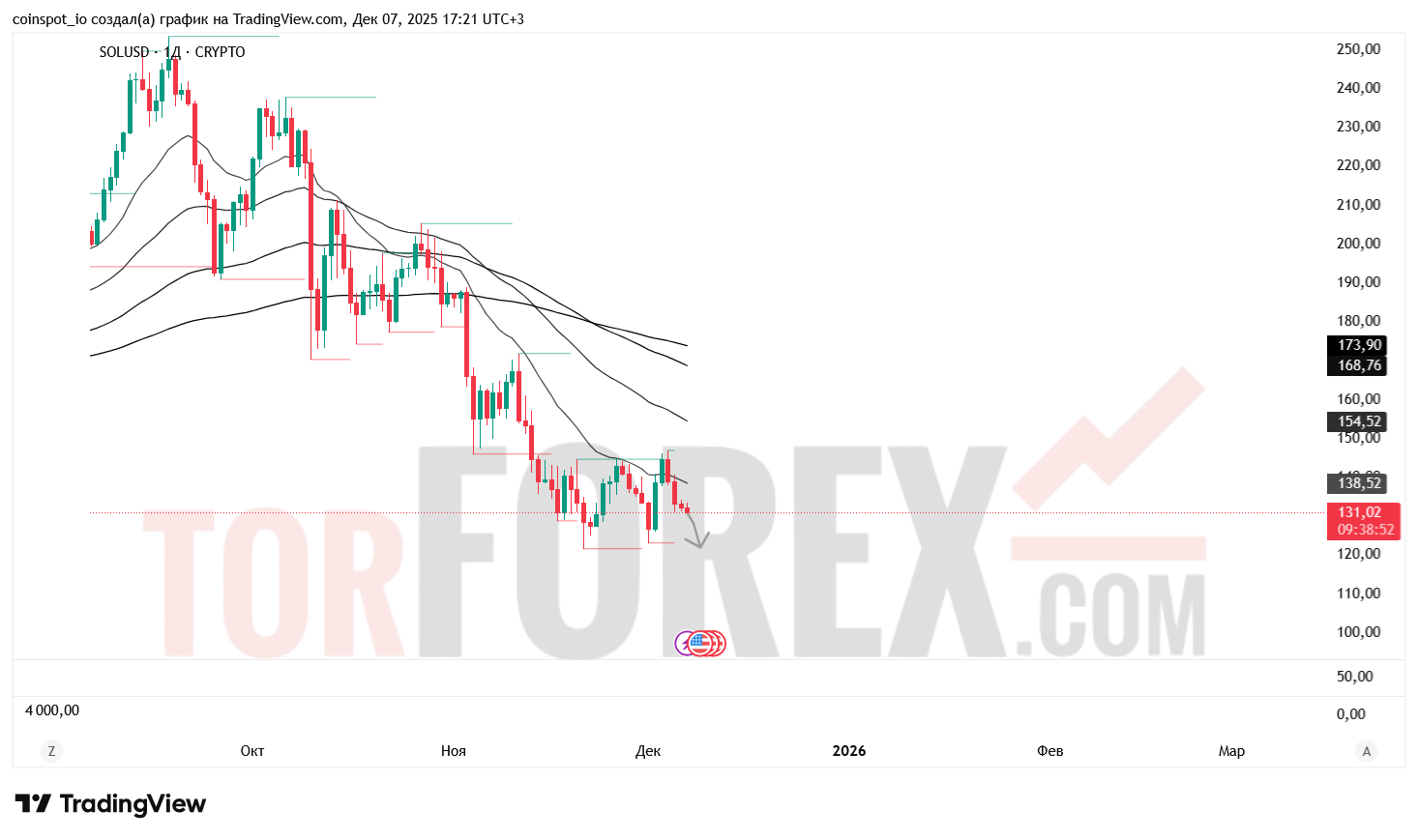 На неделю 7–14 декабря 2025 года SOL/USD демонстрирует признаки углубления коррекции. Основной сценарий — снижение к 125.00–122.50 USD при пробое поддержки. Альтернативный сценарий — отскок к 135.00–138.00 USD при удержании EMA 100.