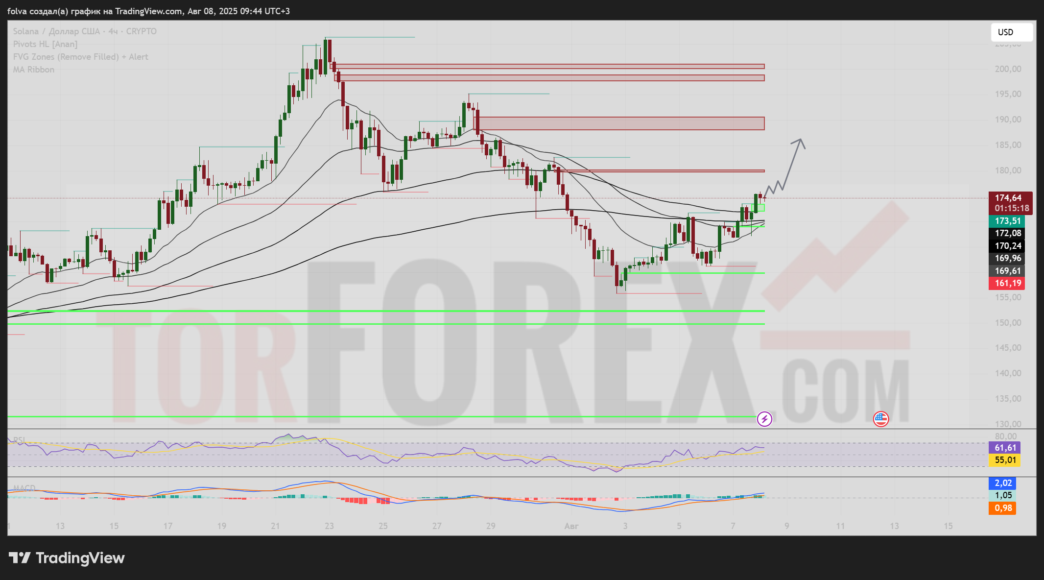 На 9 августа 2025 года техническая картина по SOL/USD остаётся бычьей, но вблизи текущих уровней есть серьёзное сопротивление, что может вызвать краткосрочную коррекцию перед новым импульсом. Устойчивый рост возможен только при пробое 175,8 долларов.