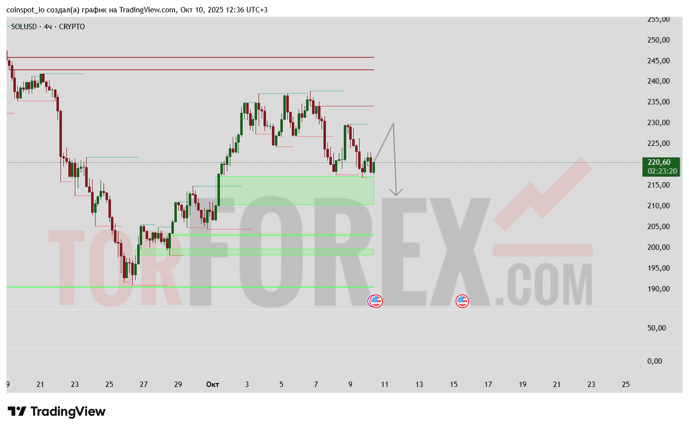 При закреплении цены ниже 215,00 USD нисходящий импульс, вероятно, усилится. Это откроет дорогу к зоне FVG 210,00-212,00 USD, которая выступит первостепенной целью. Дальнейшая динамика будет зависеть от реакции цены на этом уровне.