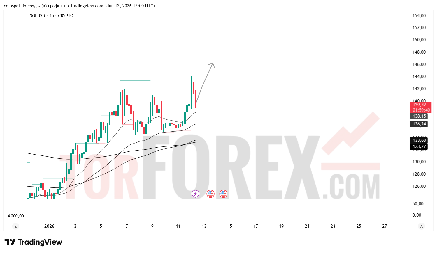 На 13 января 2026 года SOL/USD сохраняет нейтрально-бычью структуру с признаками консолидации. Основной сценарий — восстановление к 142.39–146.50 USD при пробое зоны сопротивления. Альтернативный сценарий — откат к 135.74–133.13 USD при отказе от уровня 139.33 USD.