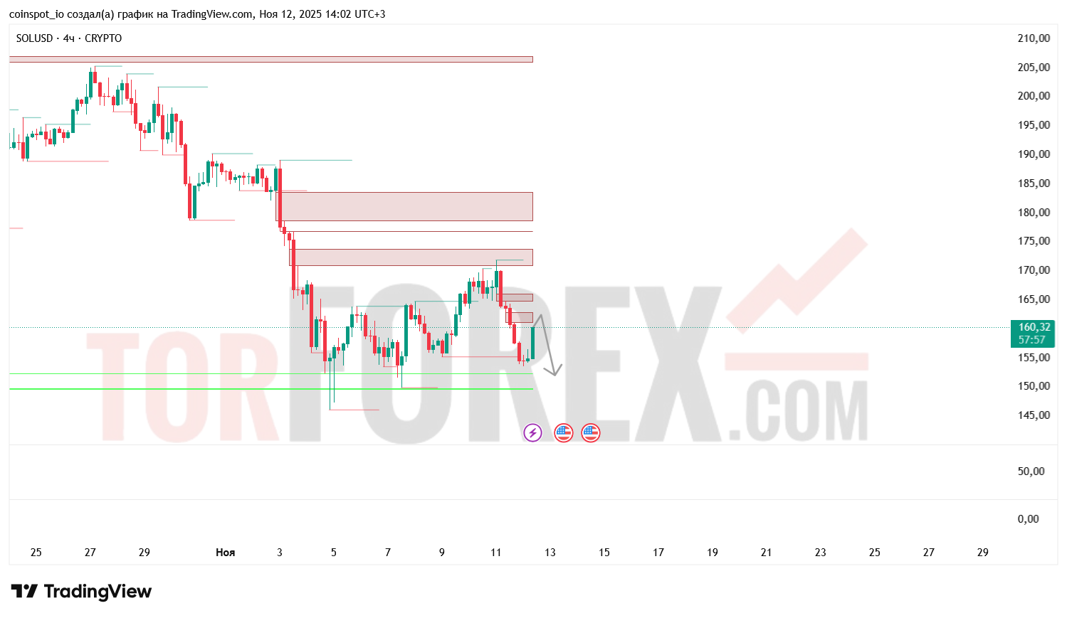 На 13 ноября 2025 года Solana (SOL/USD) демонстрирует признаки краткосрочной силы после локального роста, но структура остаётся медвежьей. Основной сценарий предполагает коррекцию от уровня 160–162 USD. Торговая идея — открытие коротких позиций при подтверждении слабости в диапазоне 159–161 USD, с целью на уровне 152 USD и стоп-лоссом выше 165 USD. Альтернативный сценарий роста к 165–167 USD возможен только при уверенном пробое сопротивления, но его вероятность ограничена без фундаментального драйвера.