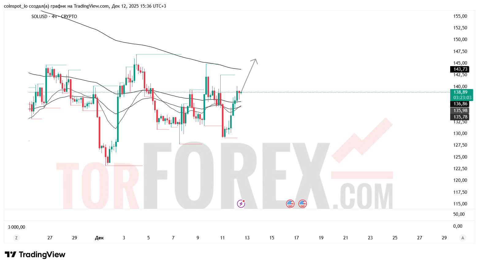 На 13 декабря 2025 года SOL/USD демонстрирует признаки восстановления. Основной сценарий — рост к 143.00–145.50 USD при пробое сопротивления. Альтернативный сценарий — снижение к 130.00–127.50 USD при отказе от уровня 140.00 USD.
