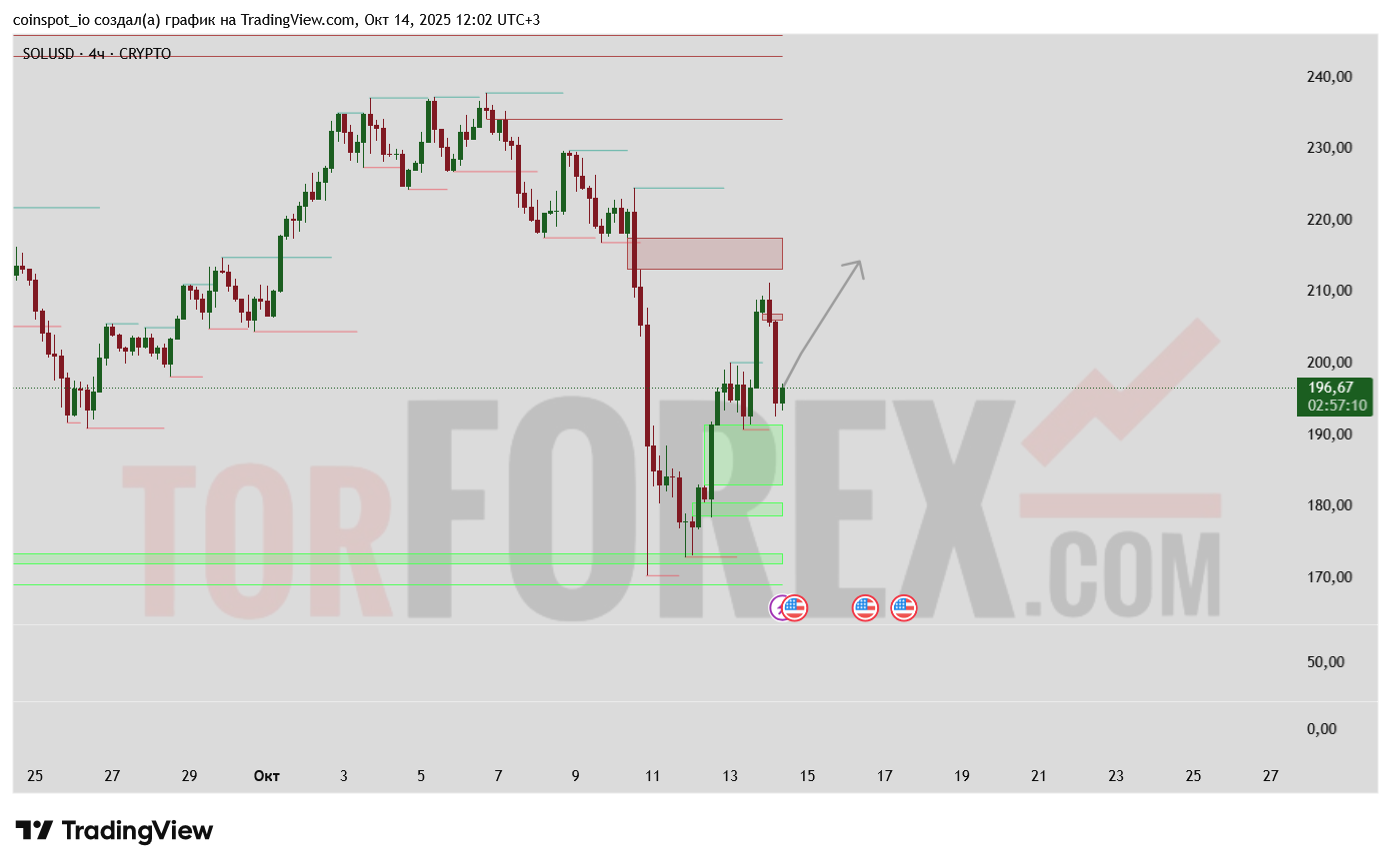 Цена 196 USD находится в зоне критического сопротивления 195-200 USD, преобразованной из предыдущих уровней поддержки. Успешное закрепление выше 200 USD откроет потенциал роста к уровням 220-240 USD. При откате значимая поддержка формируется в диапазоне 180-185 USD, где отмечаются FVG-зоны и исторические минимумы. Пробитие уровня 175 USD может активировать сценарий дальнейшего снижения.