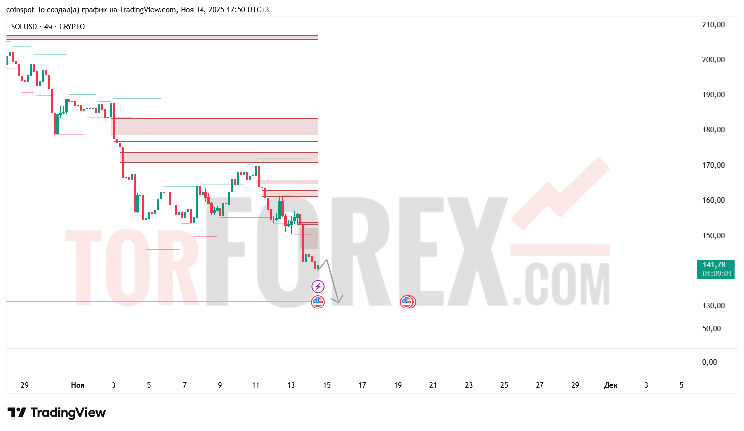 На 15 ноября 2025 года торговая пара SOL/USD сохраняет признаки слабости после пробоя ключевых поддержек. Основной сценарий предполагает продолжение снижения с целями на 132 и 128 USD. Торговая идея — открытие коротких позиций при подтверждении слабости в диапазоне 140–142 USD, с стоп-лоссом выше 145 USD. Альтернативный сценарий роста возможен только при уверенном пробое сопротивления, но его вероятность остаётся низкой.