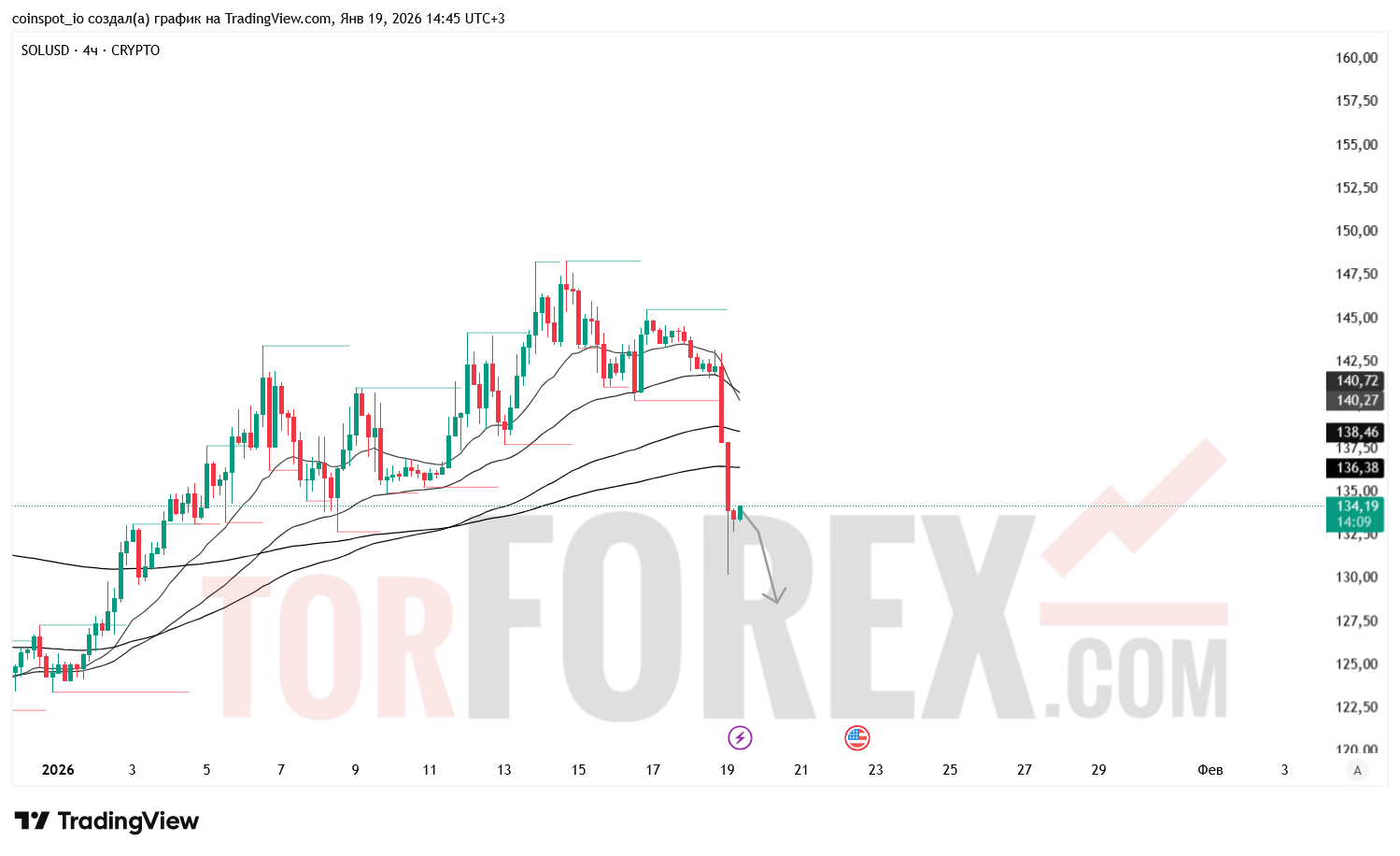 На 20 января 2026 года SOL/USD сохраняет медвежью структуру с признаками ускоренной коррекции. Основной сценарий — снижение к 130.00–128.96 USD при пробое зоны поддержки. Альтернативный сценарий — краткосрочная коррекция к 138.00–140.50 USD при отскоке от 132.00.