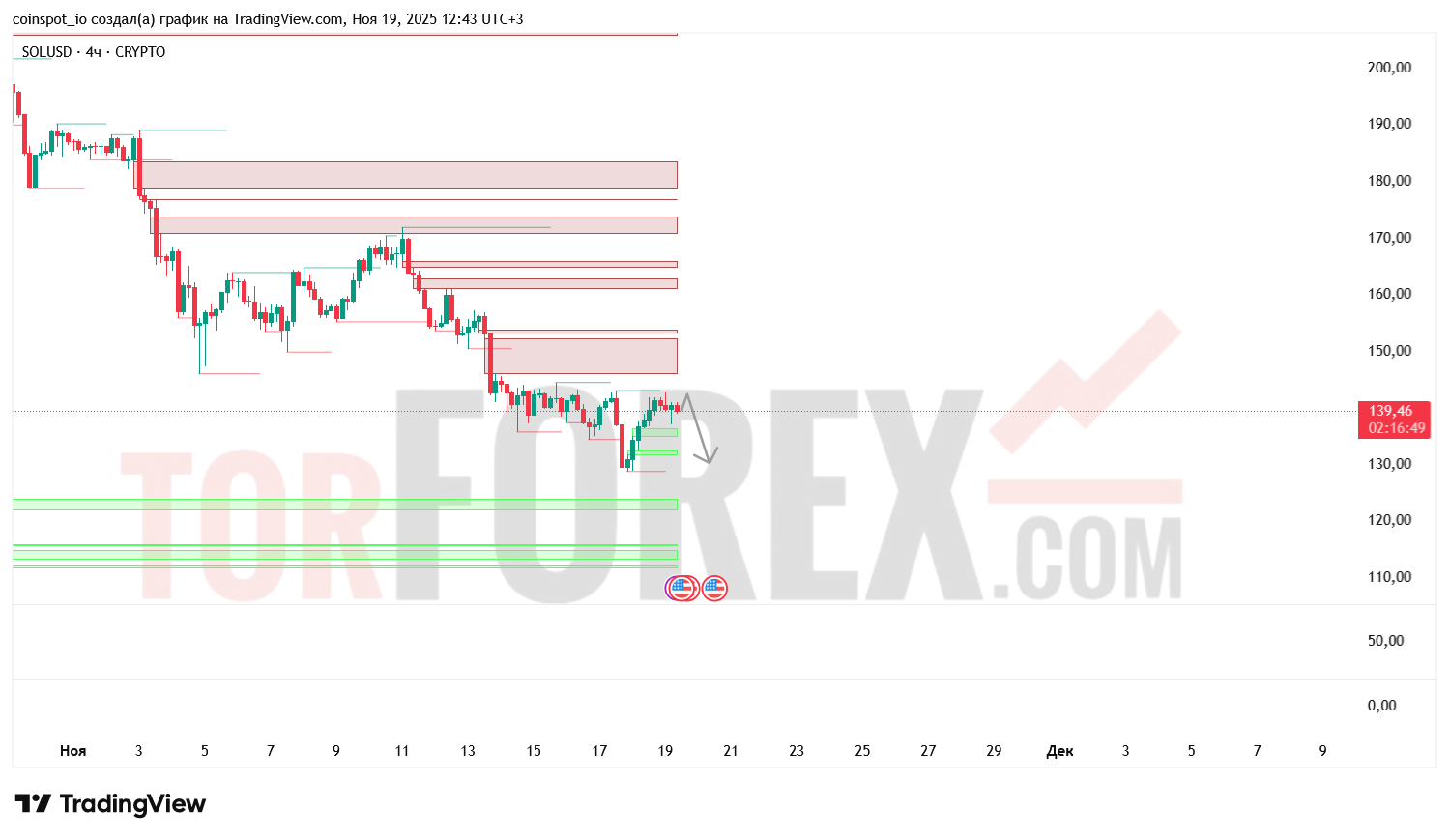 - Верхняя FVG: 145–148 USD — может быть целью при восстановлении