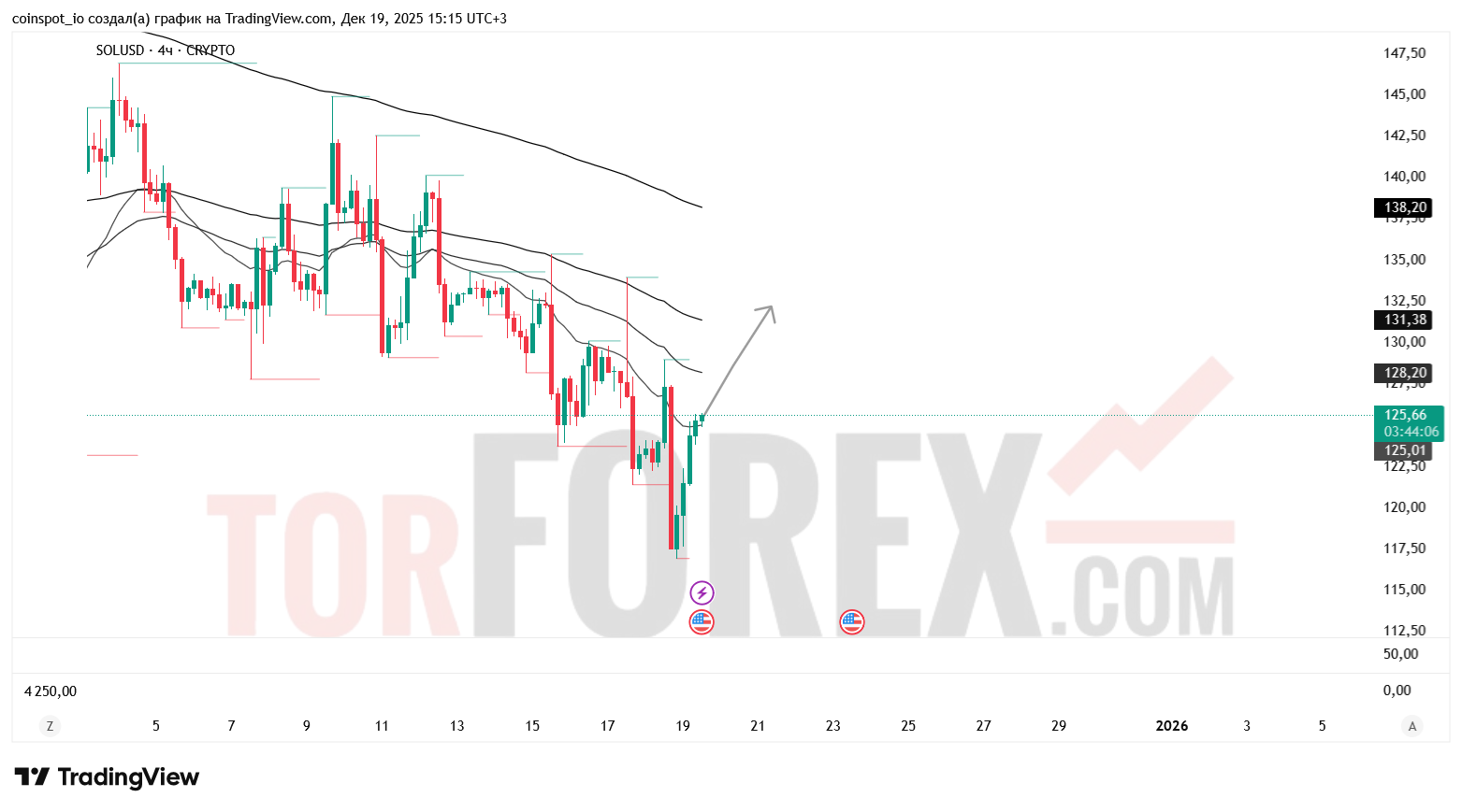На 20 декабря 2025 года SOL/USD демонстрирует устойчивый восходящий импульс. Основной сценарий — рост к 130.00–132.50 USD при пробое сопротивления. Альтернативный сценарий — снижение к 120.00–117.50 USD при отказе от уровня 128.00 USD.
