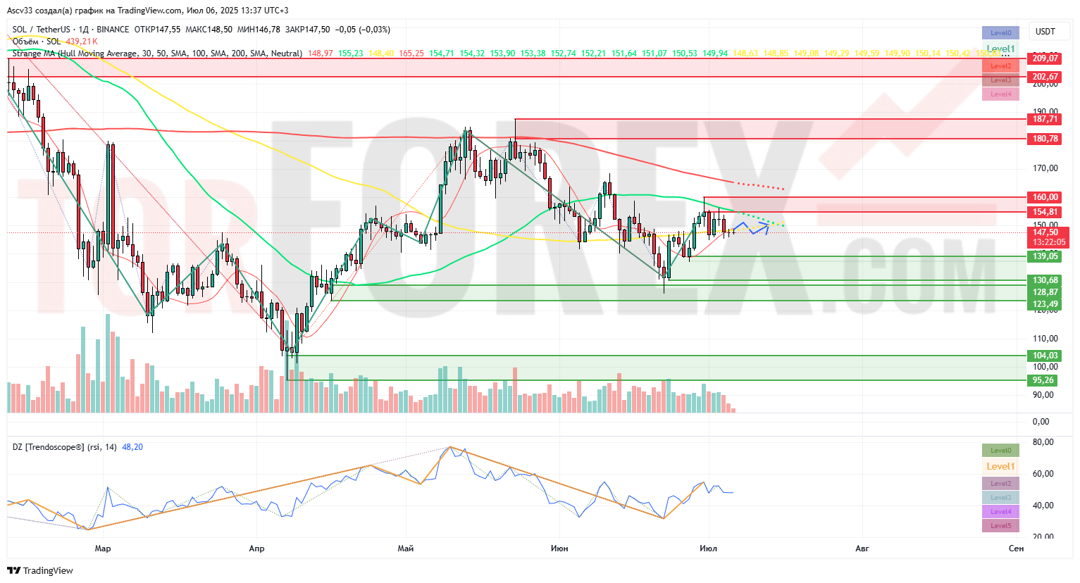 На дневном графике SOL/USD цена консолидируется у уровня 147,50, находясь под сопротивлением 154,8–160,0, которое совпадает с зоной медвежьего Order Block. Движение ограничено сверху наклонной трендовой линией и дневным FVG, а снизу — поддержкой в районе 139,0.