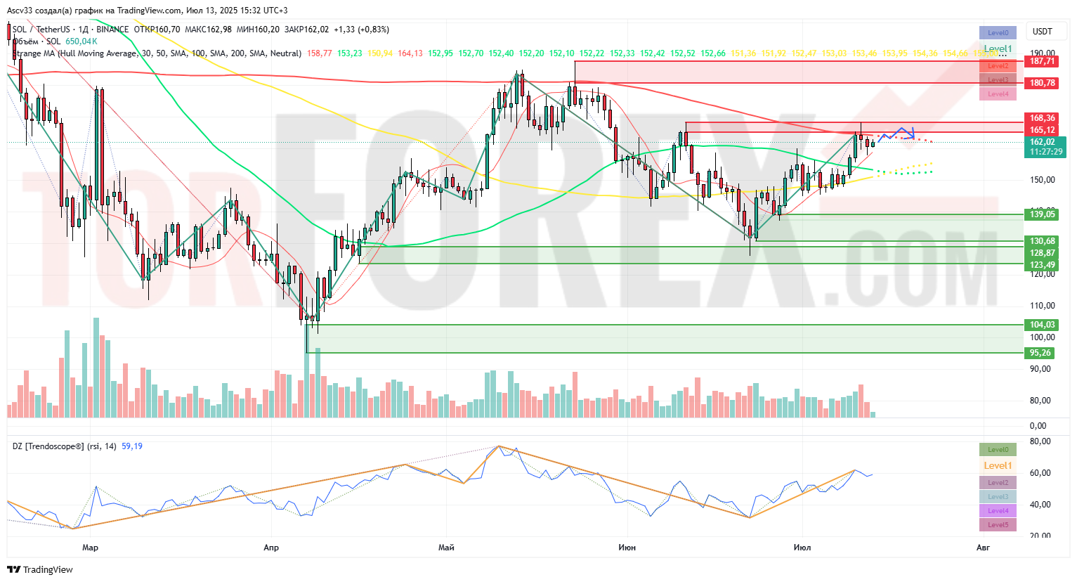Solana показывает устойчивое восстановление, но пока не может преодолеть ключевое сопротивление в районе $165–$168. Индикаторы подтверждают положительную динамику, однако рынок требует увеличения объёмов для уверенного пробоя. На текущей неделе важной будет реакция на EMA 200.