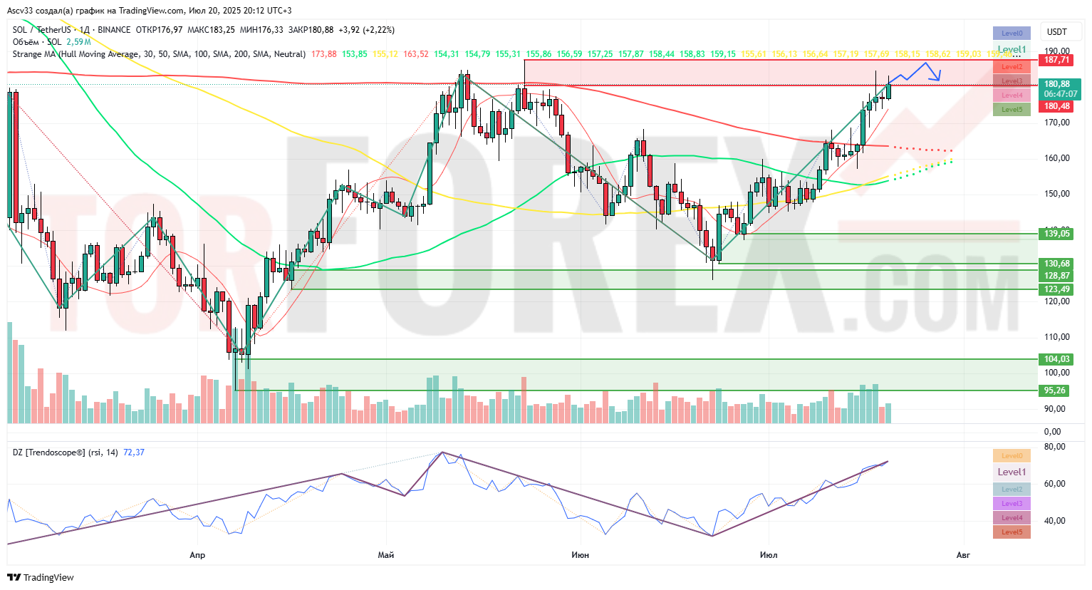Solana уверенно пробила ключевые уровни и закрепилась выше $180, но достигла зоны сопротивления $187–190, где может начаться консолидация или откат. Перекупленность по RSI повышает вероятность технической паузы.