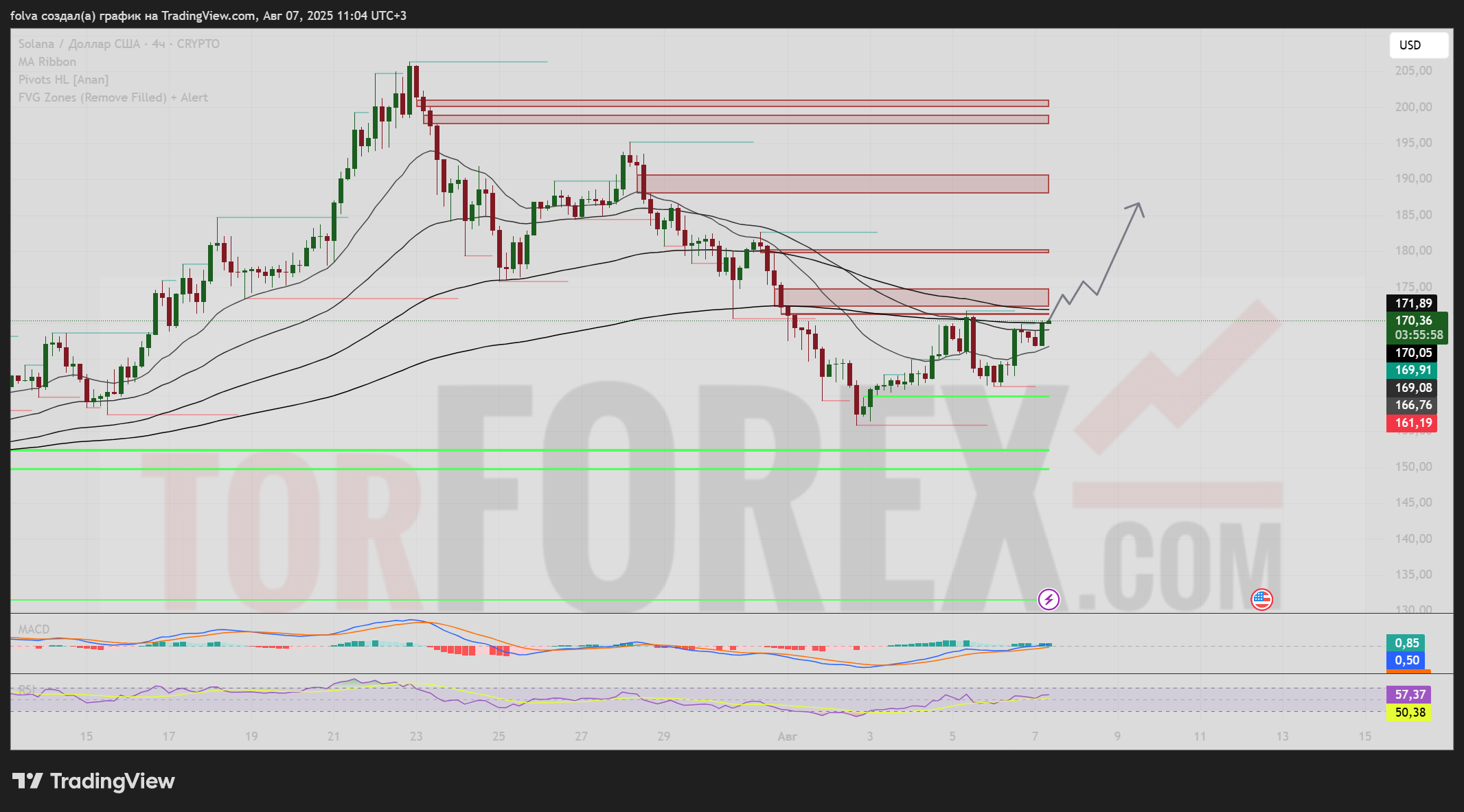 EMA-пересечения и MACD поддерживают данный сценарий при условии удержания выше $170.
