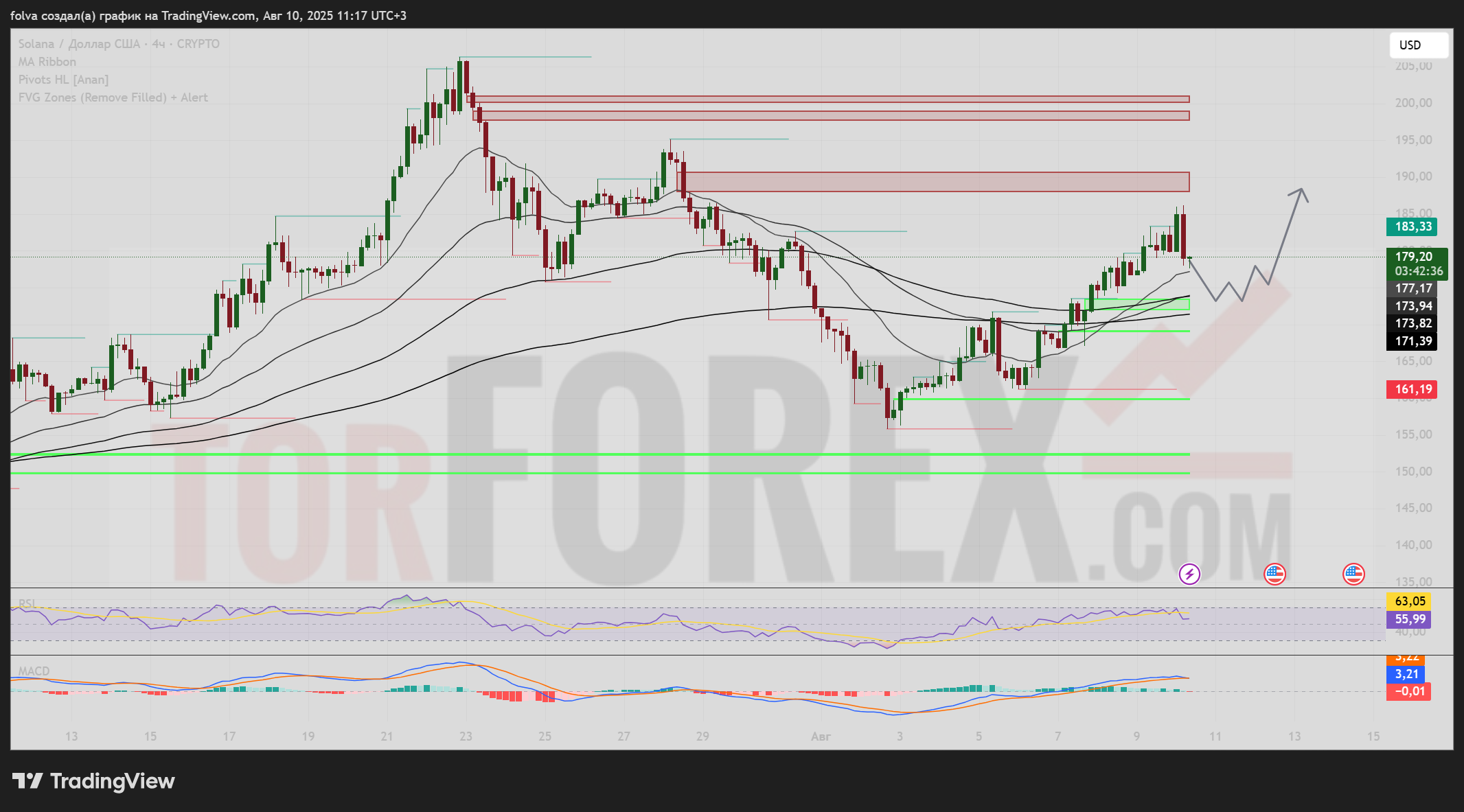 SOL/USD сохраняет восходящую структуру при условии удержания выше 173 USD. Приоритетный сценарий — повторный тест 183,33 USD с целями 189,75–195,17 USD. Коррекция к 173–170 USD будет рассматриваться как возможность для набора позиций в рамках среднесрочного роста.