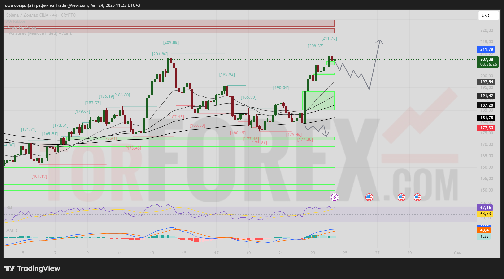 Если SOL/USD закрепится выше 211 долларов, следующей целью станет зона 220–225 долларов. В случае сильного импульса возможен рост к 230–235 долларов, где ранее наблюдались активные продажи.