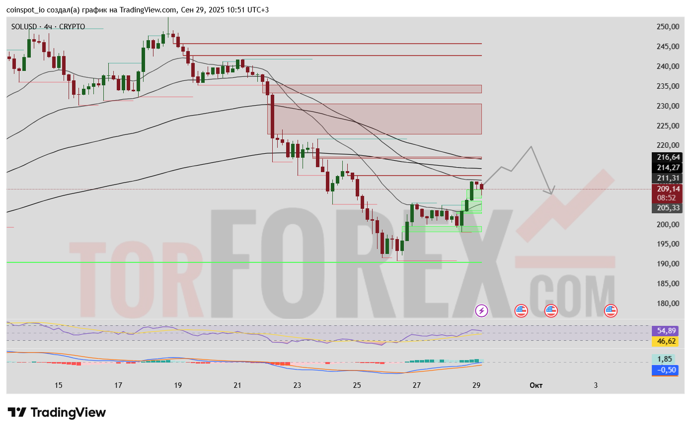 Бычий сценарий: Реализуется при успешном удержании уровня $209.17 и последующем пробое сопротивления $214.72. Это может активизировать движение к следующим целям в районе $220.00-$225.00. Ключевым условием является закрепление выше локальных максимумов и улучшение динамики индикаторов.