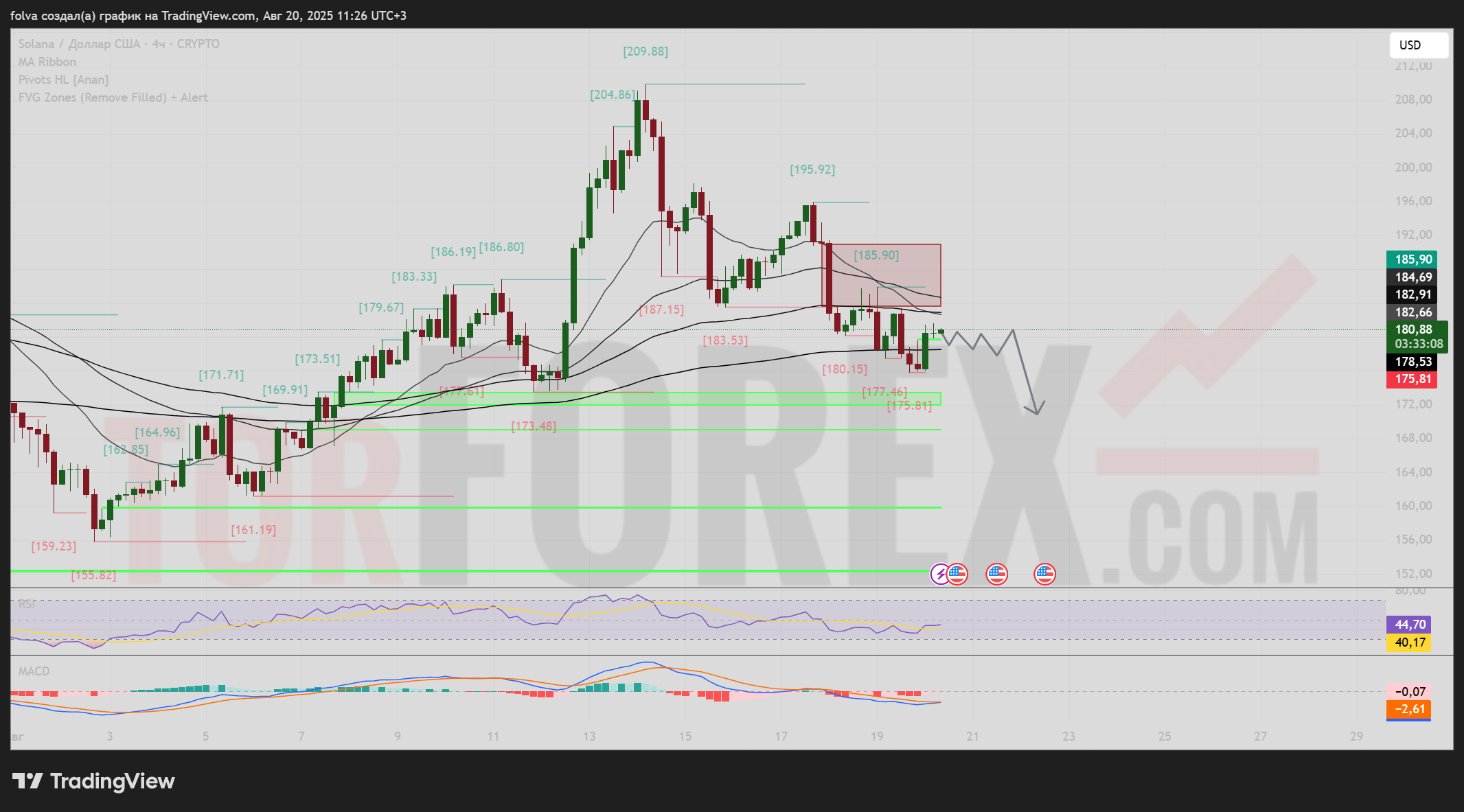 На 21 августа 2025 года торговая пара SOL/USD остаётся в фазе коррекции с риском теста более низких уровней. Пока цена не закрепилась выше 186–190 долларов, общий настрой остаётся медвежьим.