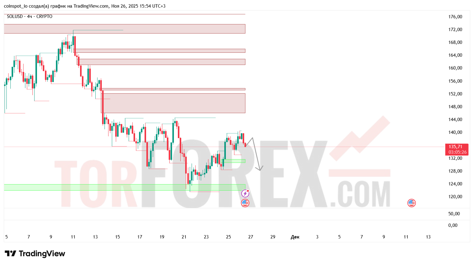 На 27 ноября 2025 года SOL/USD демонстрирует признаки замедления импульса. Основной сценарий — коррекция к 130–128 USD. Торговая идея: открытие коротких позиций при отказе от 138 USD, с стоп-лоссом выше 139.5 USD. Альтернативный сценарий — лонг при закреплении выше 138 USD, с целями 142 и 145 USD, и стоп-лоссом ниже 136 USD.