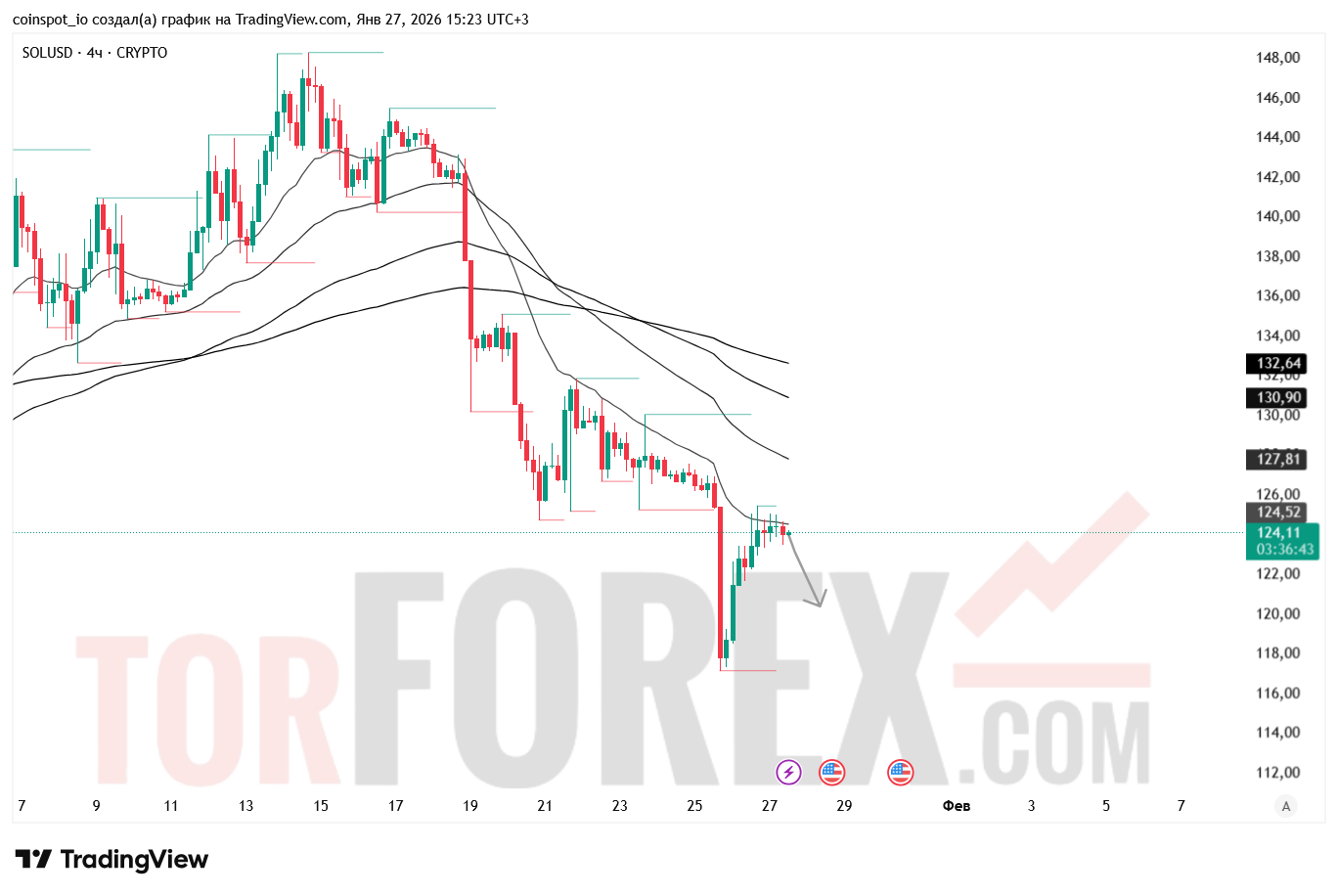 На 28 января 2026 года SOL/USD сохраняет нейтрально-медвежью структуру с признаками консолидации. Основной сценарий — снижение к 120.50–118.80 USD при пробое поддержки. Альтернативный сценарий — рост к 128.00–130.50 USD при пробое зоны сопротивления.