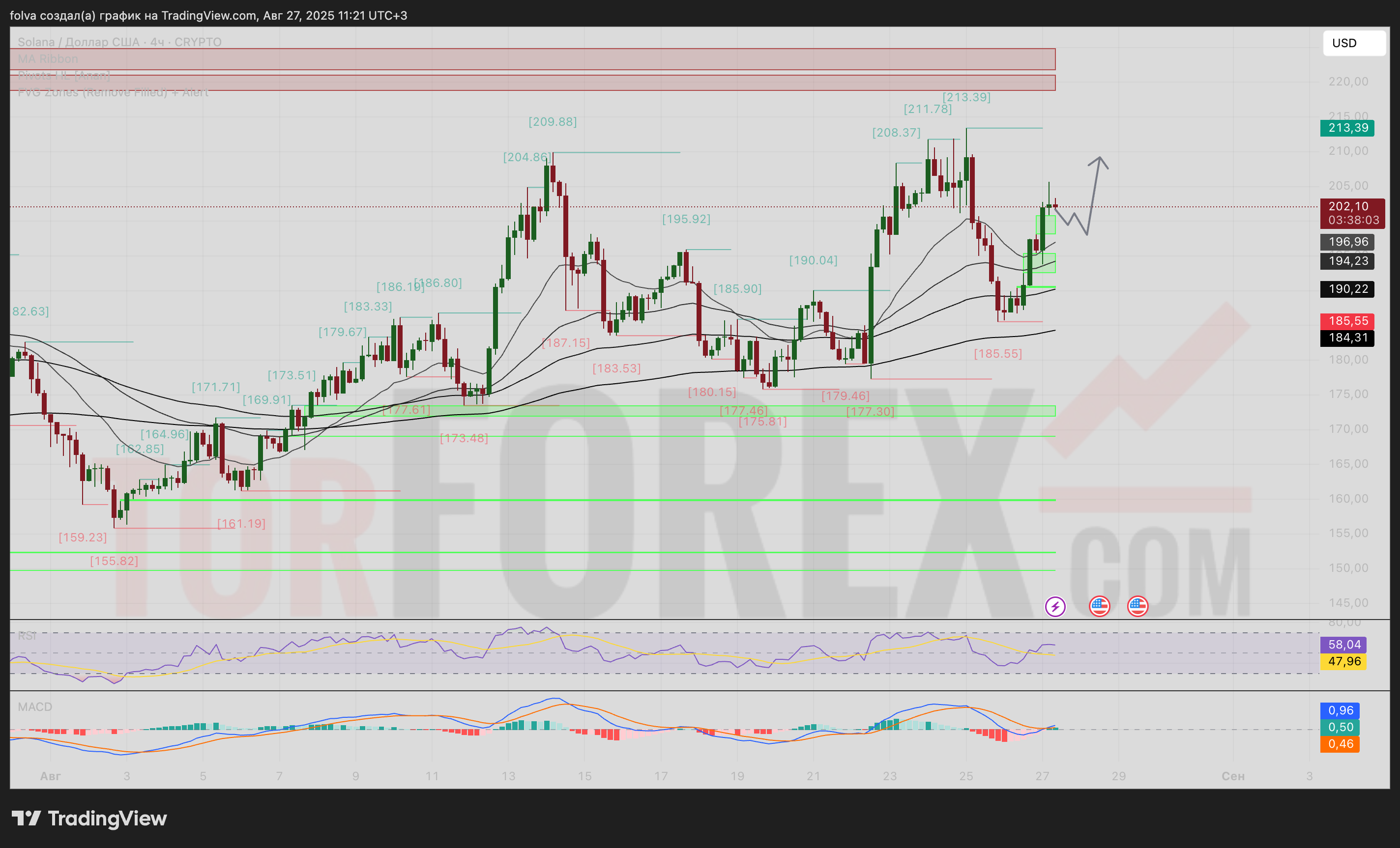 При пробое уровня сопротивления $213.39 с подтверждением объемами, цена SOL может направиться к тестированию психологической отметки $220-$225. Целевые уровни для роста располагаются в зонах $218-$220 и $225-$230. Поддержку этому сценарию оказывают позитивные показания MACD и расположение цены выше всех ключевых EMA.