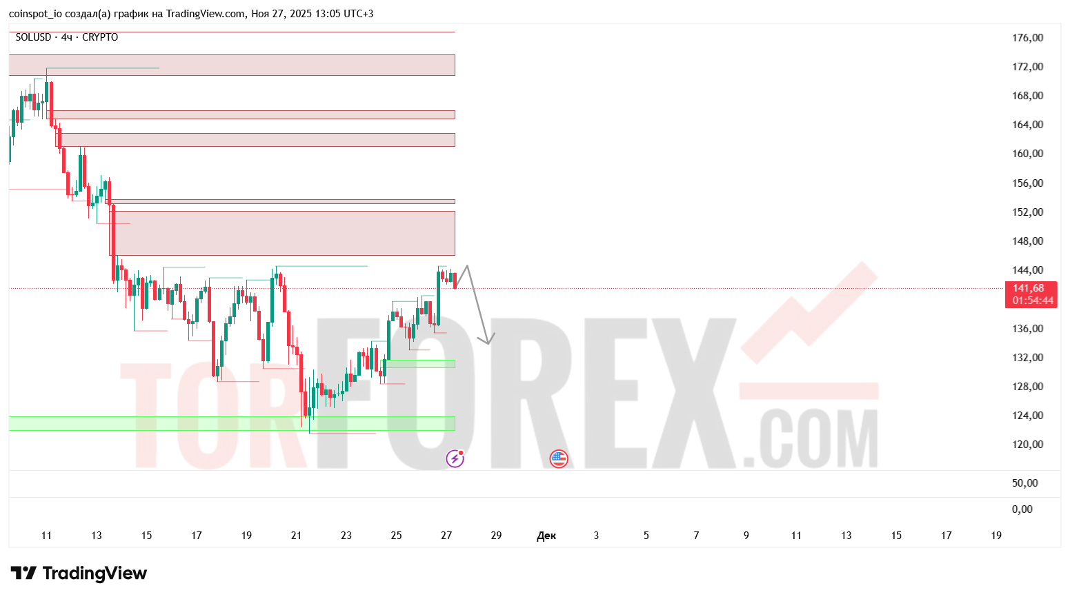 На 28 ноября 2025 года SOL/USD сохраняет нейтральный импульс с риском отката. Основной сценарий — снижение к 137.00–134.50 USD при отказе от сопротивления 144.00 USD. Альтернативный сценарий — рост к 147.50–150.00 USD при закреплении выше 144.00 USD.