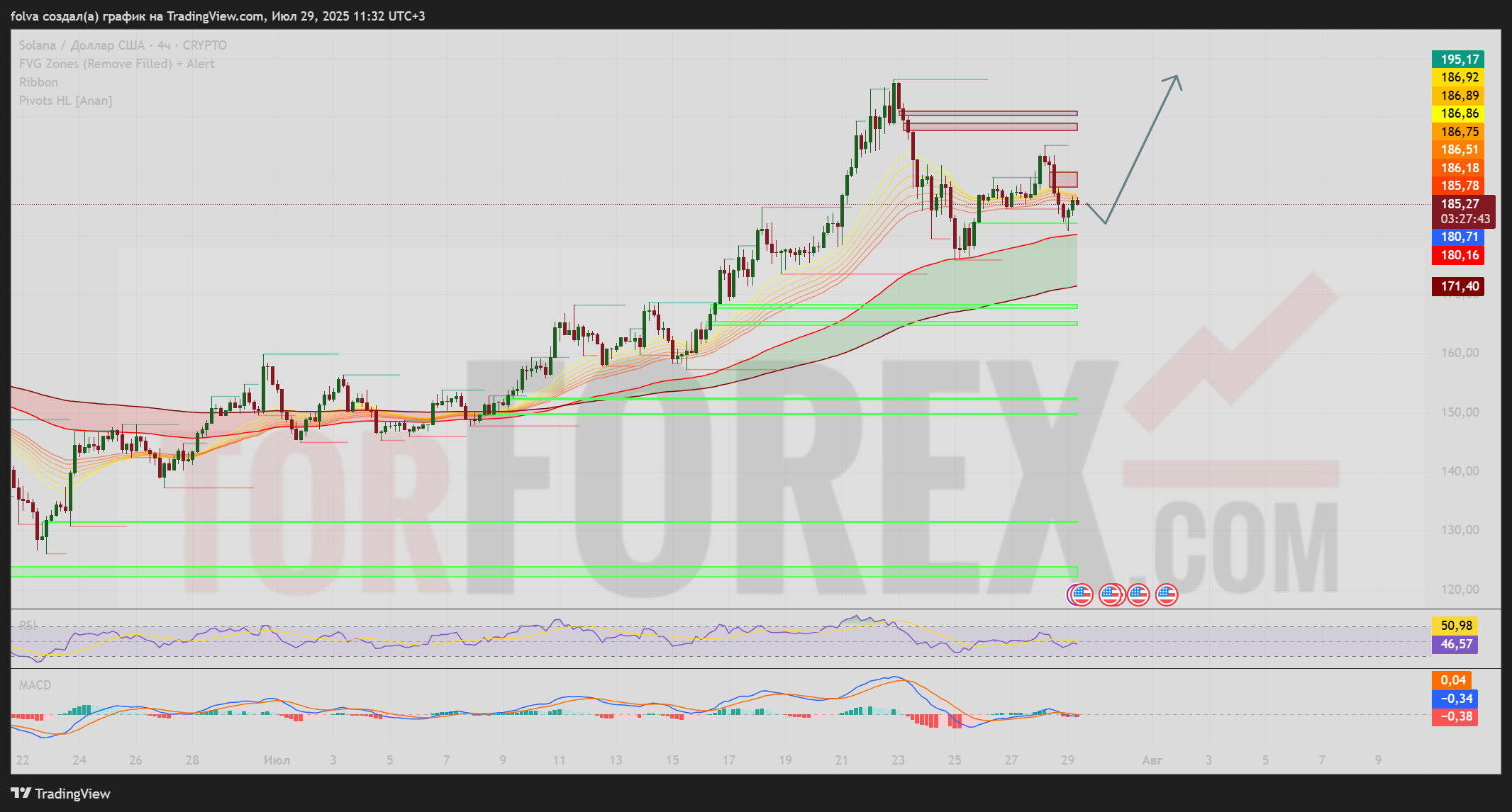 Рынок SOL/USD находится в фазе технической коррекции в рамках восходящего тренда. Индикаторы RSI и MACD указывают на возможную краткосрочную слабость быков. Структура рынка остаётся бычьей, пока удерживается поддержка в районе $175–$180. В случае прорыва сопротивления в зоне $186,85–$189,75, вероятен возврат к тесту $200.