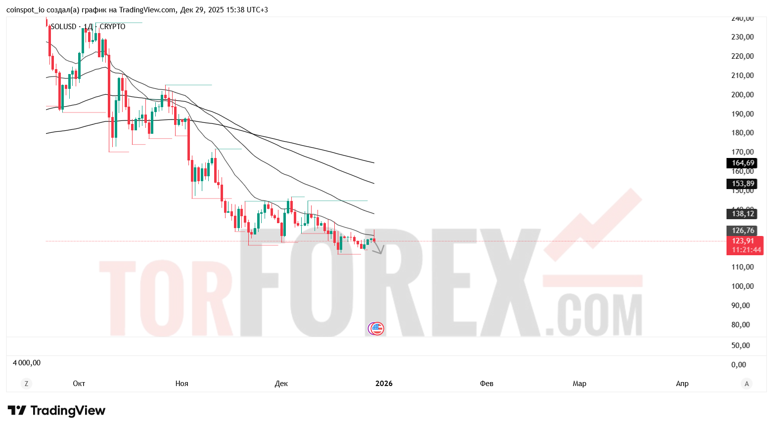 На 30 декабря 2025 года SOL/USD сохраняет медвежью структуру с признаками усиления нисходящего импульса. Основной сценарий — снижение к 121.00–118.50 USD при отказе от EMA 20. Альтернативный сценарий — восстановление к 127.50–130.00 USD при пробое зоны сопротивления.