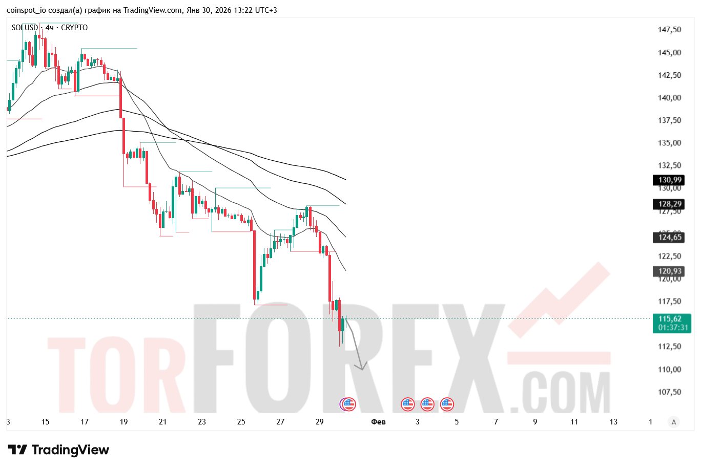 Solana завершает 4‑часовую сессию на отметке 115.14 USD, снизившись на 2.13%. После неудачного теста зоны 118.50–119.00 USD инструмент продолжает движение в нисходящем канале, формируя новые минимумы и усиливая давление со стороны продавцов. Волатильность остаётся повышенной, а покупатели не демонстрируют признаков инициативы. Пробой краткосрочных уровней поддержки и рост объёмов на снижении подтверждают доминирование медвежьего импульса.