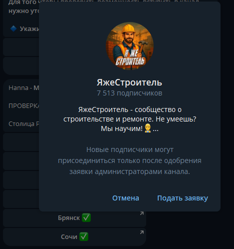 Чтобы подписаться на канал Анастасии, необходимо пройти череду проверок ботом. Первый клик на сообщение с подтверждением подписки на магазин перебрасывает пользователя на сообщество о строительстве и ремонте. Затем идет ряд раздражающих проверочных вопросов, чтобы подтвердить «человечность» подписчика. Попасть в канал оказывается совсем не просто.