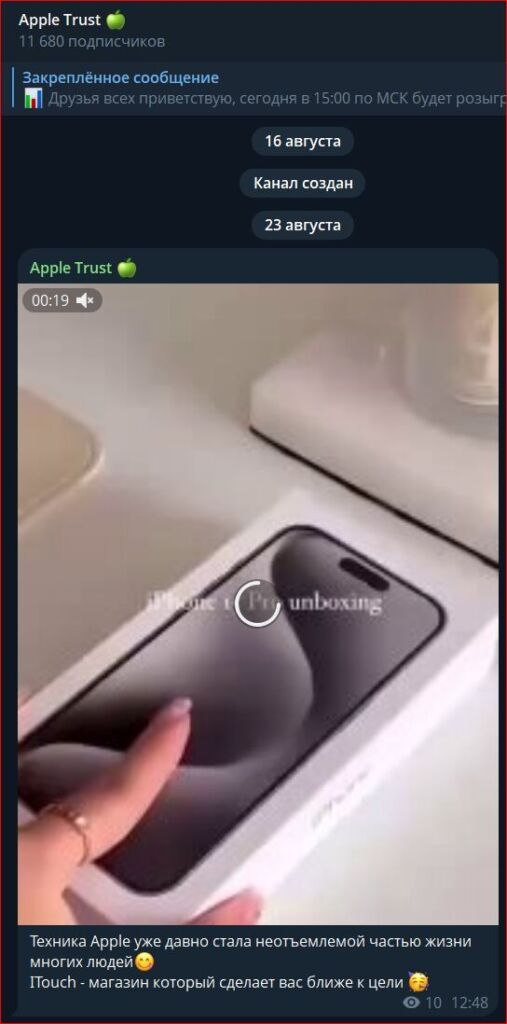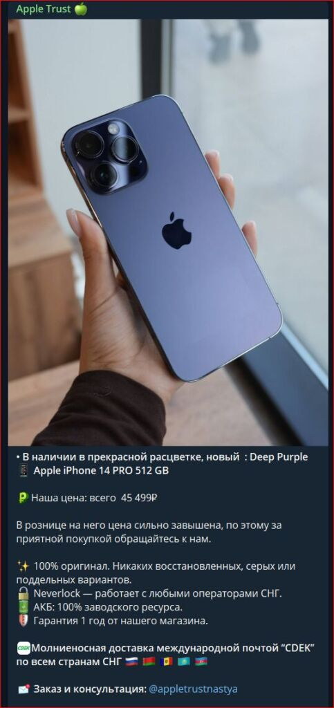 Apple Trust в мессенджере Телеграмм завоевал доверие более чем 11 000 подписчиков, заявляя о продаже брендовой техники от компании Apple по закупочной цене. Покупателям их новенькое приобретение отправлялось по почте в день заказа, а также менеджеры магазина заявляли о проверке каждой единицы товара. Естественно, что стоимость гаджетов на порядок отличалась от магазинной, поэтому желающие получить iPhone активно вступали в канал владелицы Анастасии с профилем @Appletrustnastya и следили за новыми постами и розыгрышами.