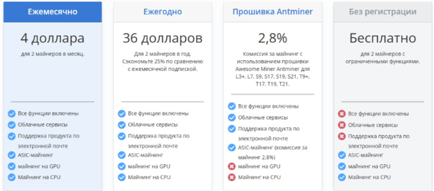 В платном варианте цена за один майнер составляет $2. Минимальное количество ригов 2, то есть стоимость за использование ПО в месяц составит $4. Если выбрать годовой план, то для 2 майнеров он будет со скидкой 25% и составит $36. Пользователи, которые будут использовать прошивку Antminer, должны будут заплатить комиссию за майнинг в размере 2,8%.