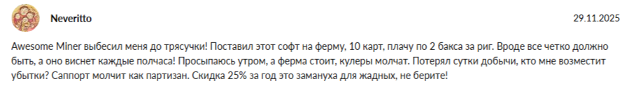 На многочисленных ресурсах есть довольно много комментариев в адрес этого ПО и подавляющая часть из них отрицательные. Один из клиентов сообщил, что запустил прогу для 10 ригов, но она стала глючить каждые полчаса. По итогу юзер обнаружил, что за сутки он ничего не заработал. На жалобы юзера служба поддержки не ответила.