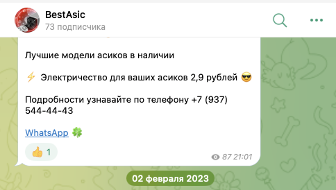 ТГК BestAsic был создан 13 октября 2022-го, а первый пост в его ленту выложили 3 ноября того же года. Активность на telegram-канале проявляли недолго, всего на протяжении нескольких месяцев. Последняя публикация на нем появилась еще в феврале 2023-го. То есть данный проект уже давно заброшен и его не планируют возрождать.