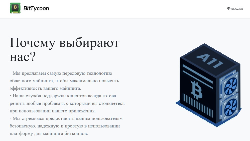 Однако на официальном сайте проекта bit tycoon com какой-либо конкретной информации о имеющихся вычислительных мощностях, применяемых технологиях и расположении майнингового оборудования, попросту нет. Есть лишь поверхностные сведения, которые больше похожи на рекламу и не несут в себе никакой практической пользы.