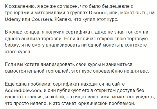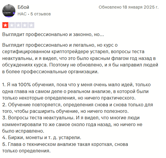 Но есть и негатив. Главная претензия – устаревший контент. Курсы созданы в 2023 году и не обновляются. Данные неактуальные: награда за блок биткоина указана неверно, биржи и монеты потеряли актуальность.