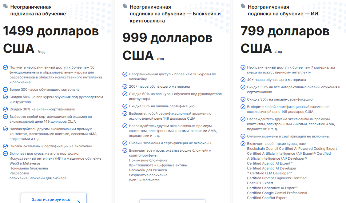 После курса сдается онлайн-экзамен. Сертификат дается на пожизненно. Материалы остаются доступны навсегда. Экзамен сдается когда удобно, но рекомендуют уложиться в 10 дней.Кроме отдельных курсов есть подписки. Безлимитная стоит 1499 долларов в год – дает 50+ курсов и 300+ часов контента. По блокчейну и криптовалютам – 999 долларов. По ИИ – 799 долларов годовых.