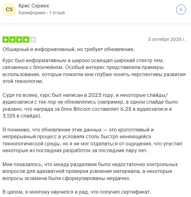 На Trustpilot 260 отзывов о Blockchain Council со средней оценкой 4.4 балла. Картина противоречивая. Положительные моменты отмечают широкий охват тем и полезные примеры применения технологий. Экзамены помогают выявить слабые места.