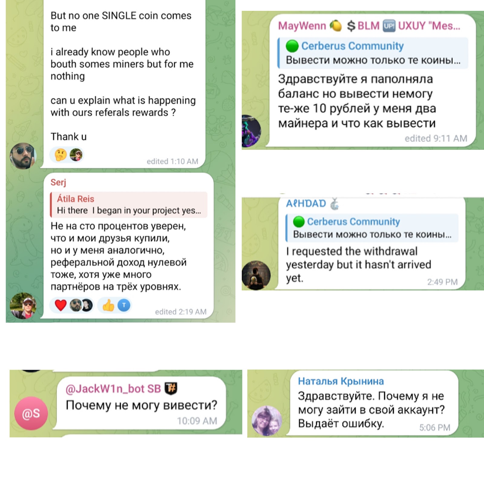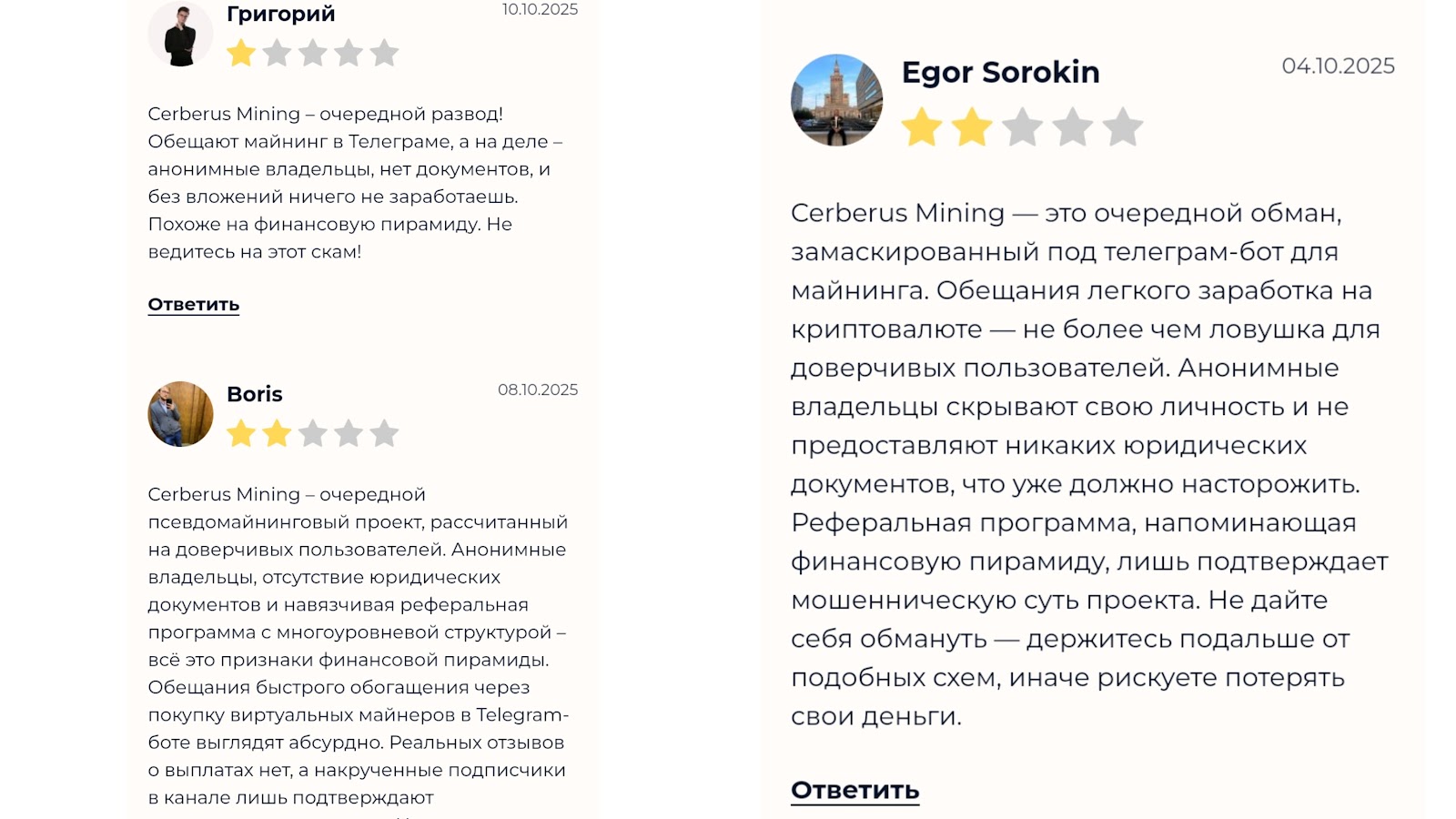 В сети также можно увидеть отзывы, указывающие на признаки лохотрона у Cerberus Mining.