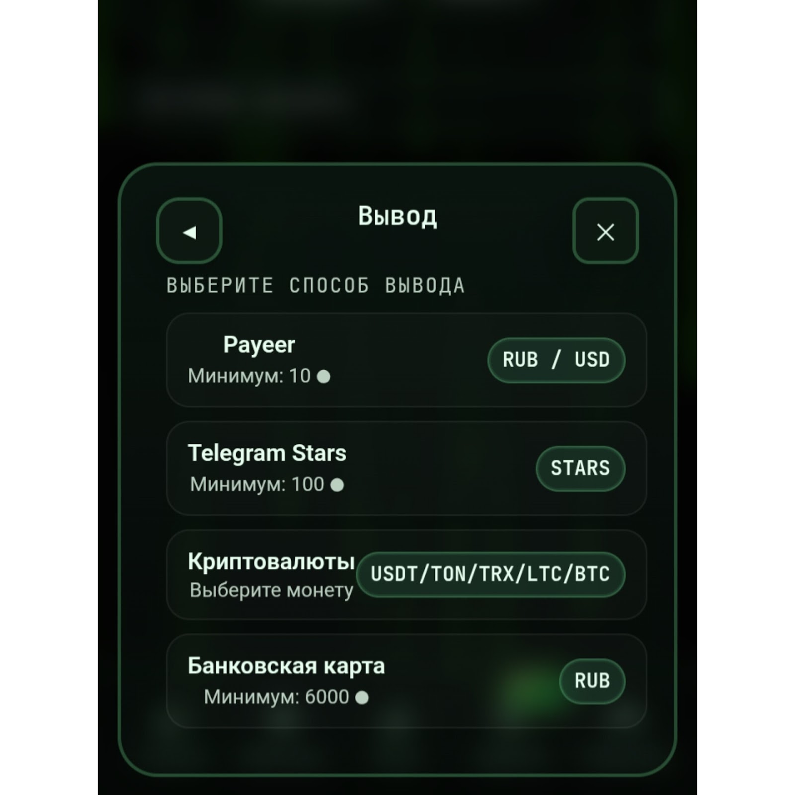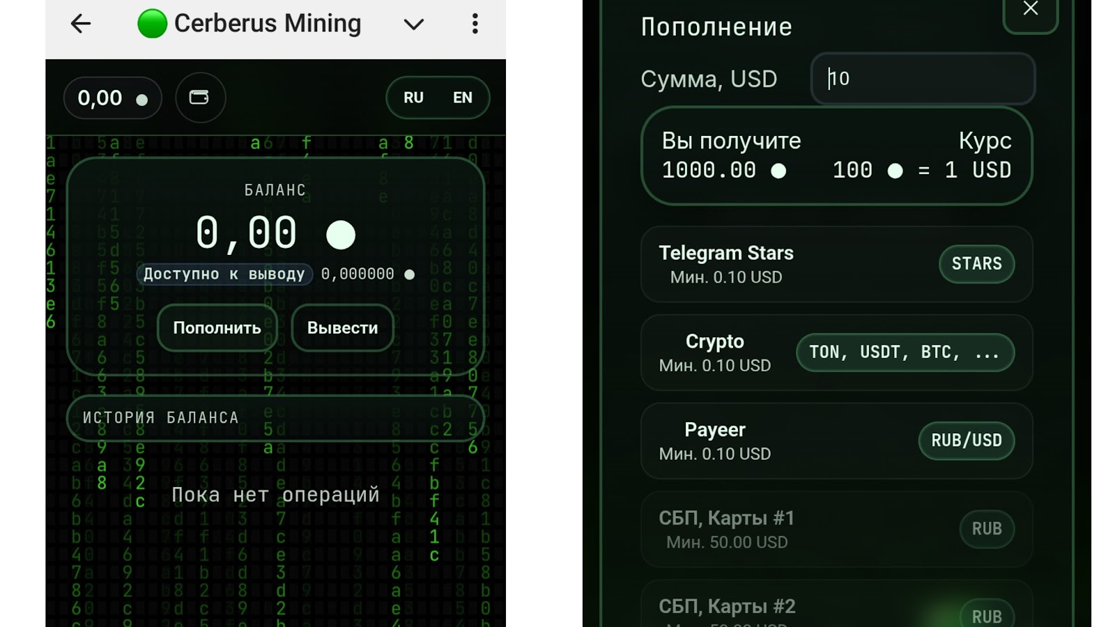 Депозиты принимаются с: Telegram, Stars, Crypto, Payeer или СБП. При выборе крайнего метода нужно переводить 50.00 USD. Для вывода денег с бота Cerberus Mining нужно сделать аналогичным методом, однако указать функцию “Вывод”. Проект установил такие лимиты на снятие прибыли:
