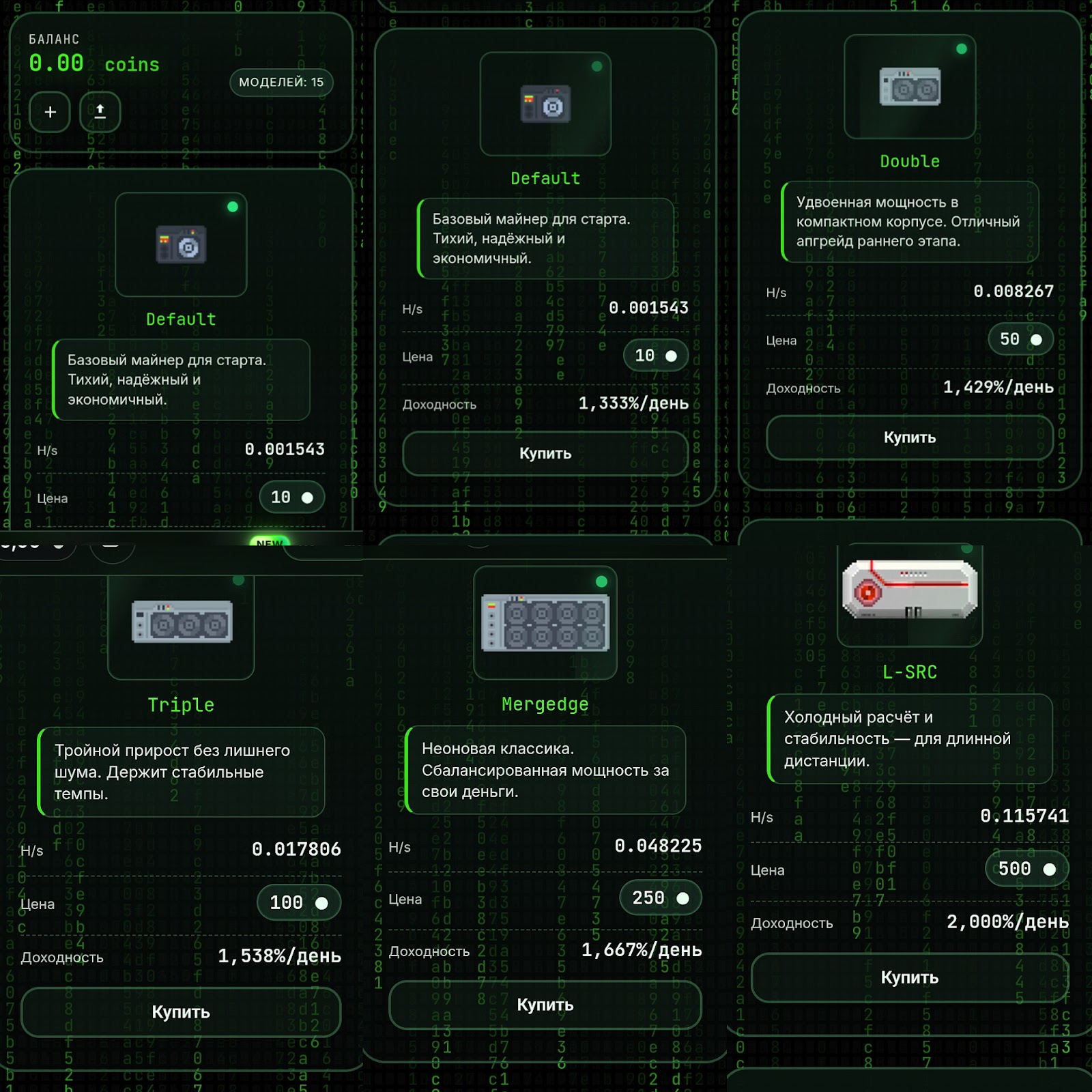 Также есть и прочее оборудование, и самое дорогое стоит 25 000 монет с обещанным доходом в 5.000% в сутки. Пользователи могут запускать такие игры для дополнительных наград: