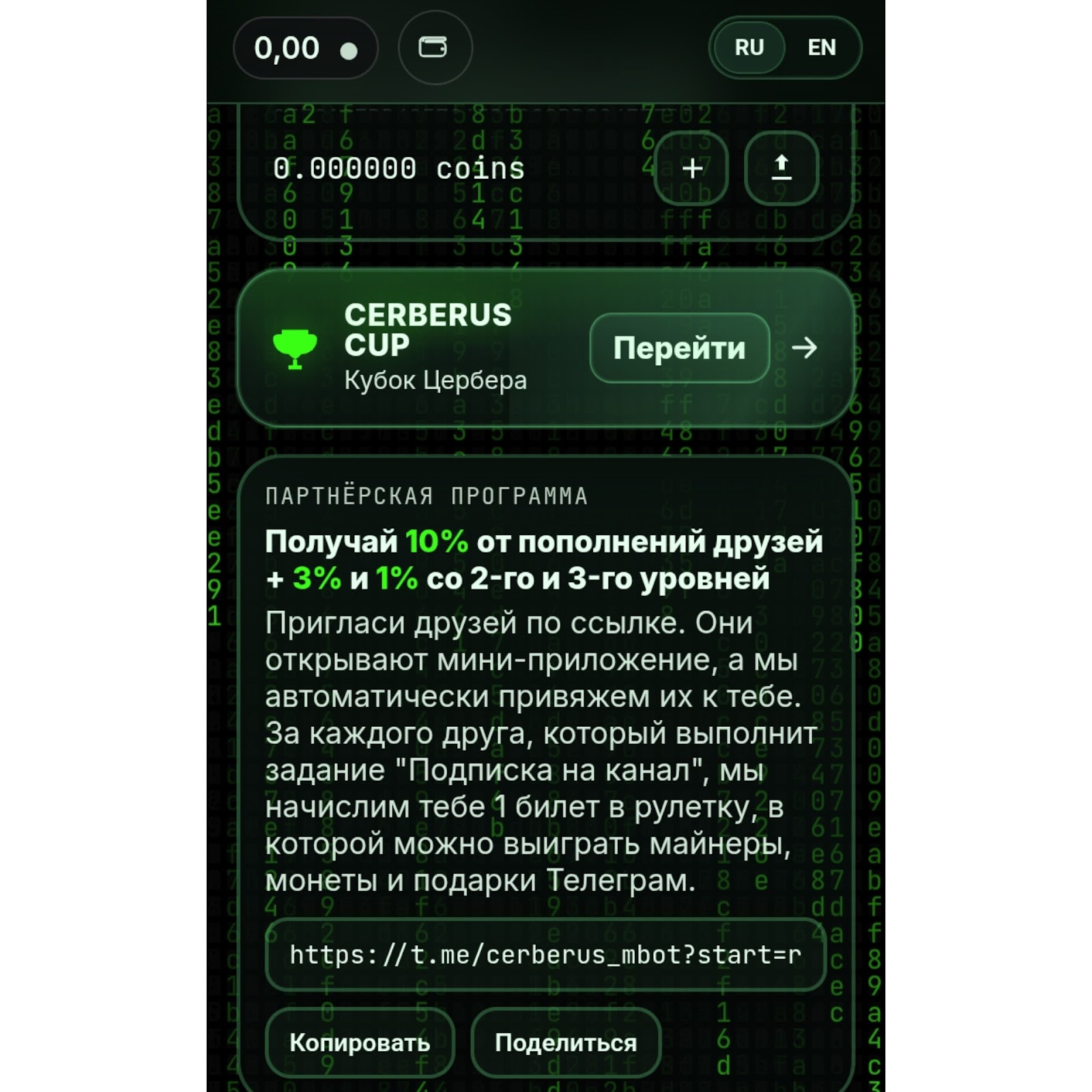 Cerberus Mining — это тг-приложение, которое предлагает майнить монеты и преобразовывать их в настоящие деньги. Пользователи могут запускать мини-игры, сражаясь с другими майнерами, а также выполнять различные задания. У проекта есть многоуровневая реферальная программа, и далее расскажем о боте подробнее.