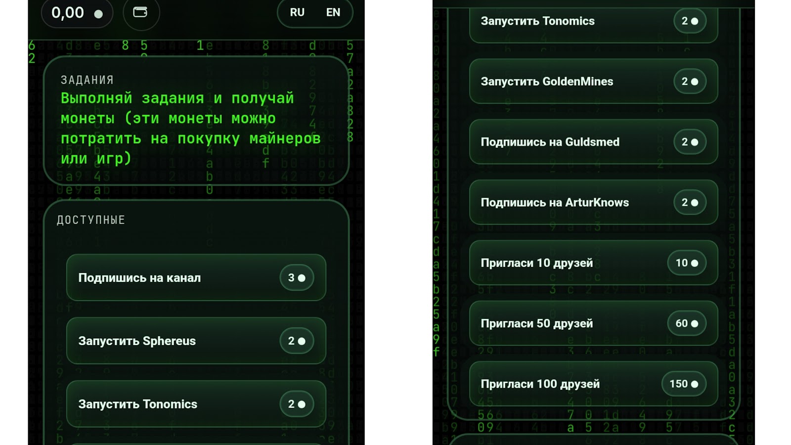 Телеграм-приложение Cerberus Mining предлагает подписаться на тг-канал проекта, получив 3 коина. Также можно запускать сторонние боты за 2 монеты на каждого.