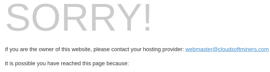 Сразу после игнорирования предупреждения мы все равно не получили доступ к контенту. Оказалось, что домен CloudSoftMiners Com тоже удален с хостинга, а это подтверждает факт сомнительности проекта. Ведь поисковый робот исключает платформы из выдачи только в самом крайнем случае.