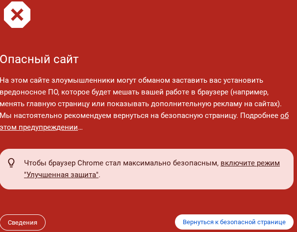 При переходе по ссылке пользователь получает следующее оповещение — «На этом сайте злоумышленники могут обманом заставить вас установить вредоносное ПО, которое будет мешать вашей работе в браузере (например, менять главную страницу или показывать дополнительную рекламу на сайтах)». Это означает, что CloudSoftMiners Com с большой долей вероятности ворует данные.