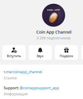 К эрн платформе относится официальный тг-канал криптовалютного комьюнити под названием Coinapp channel. На сообщество подписано 3 209 пользователей. Поддержка фолловеров осуществляется техническим специалистом, владеющим профилем Coinappsupport app.