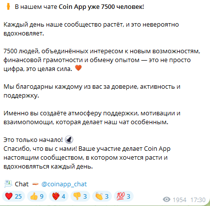 Всех участников тг-клуба «КоинАпп Ченел» создатели криптоплатформы приглашают присоединиться к общему чату под названием Coinapp chat. В настоящее время на сообщество пописано 8 367 фолловеров.