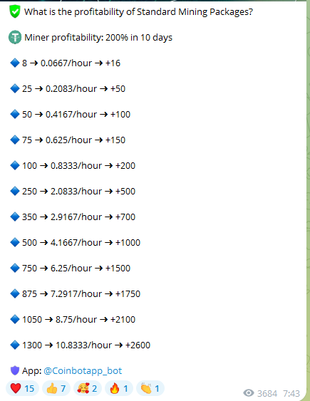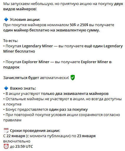 В TG группе опубликован mining план, согласно которому можно рассчитывать на результат в 200% профита за 10 дней. На канале администраторами продаются майнеры и устраиваются акции. Так, покупая miners номиналом 50 долларов и 250 долларов, можно получить 1 earn аппарат бесплатно.