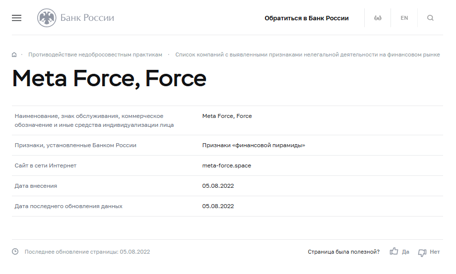Вот так выглядит заключение Банка России о проекте Meta Force. Компания имеет признаки финансовой пирамиды и запрещена на территории РФ.